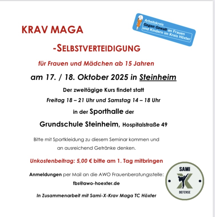 In Kooperation mit dem Arbeitskreis „Gewalt gegen Frauen und Mädchen im Kreis Höxter“ bieten wir als „Beratungsstelle gegen Gewalt an Frauen“ und SAMI-X Krav Maga Höxter ein Selbstverteidigungsseminar für Frauen und Mädchen ab 15 Jahren an.